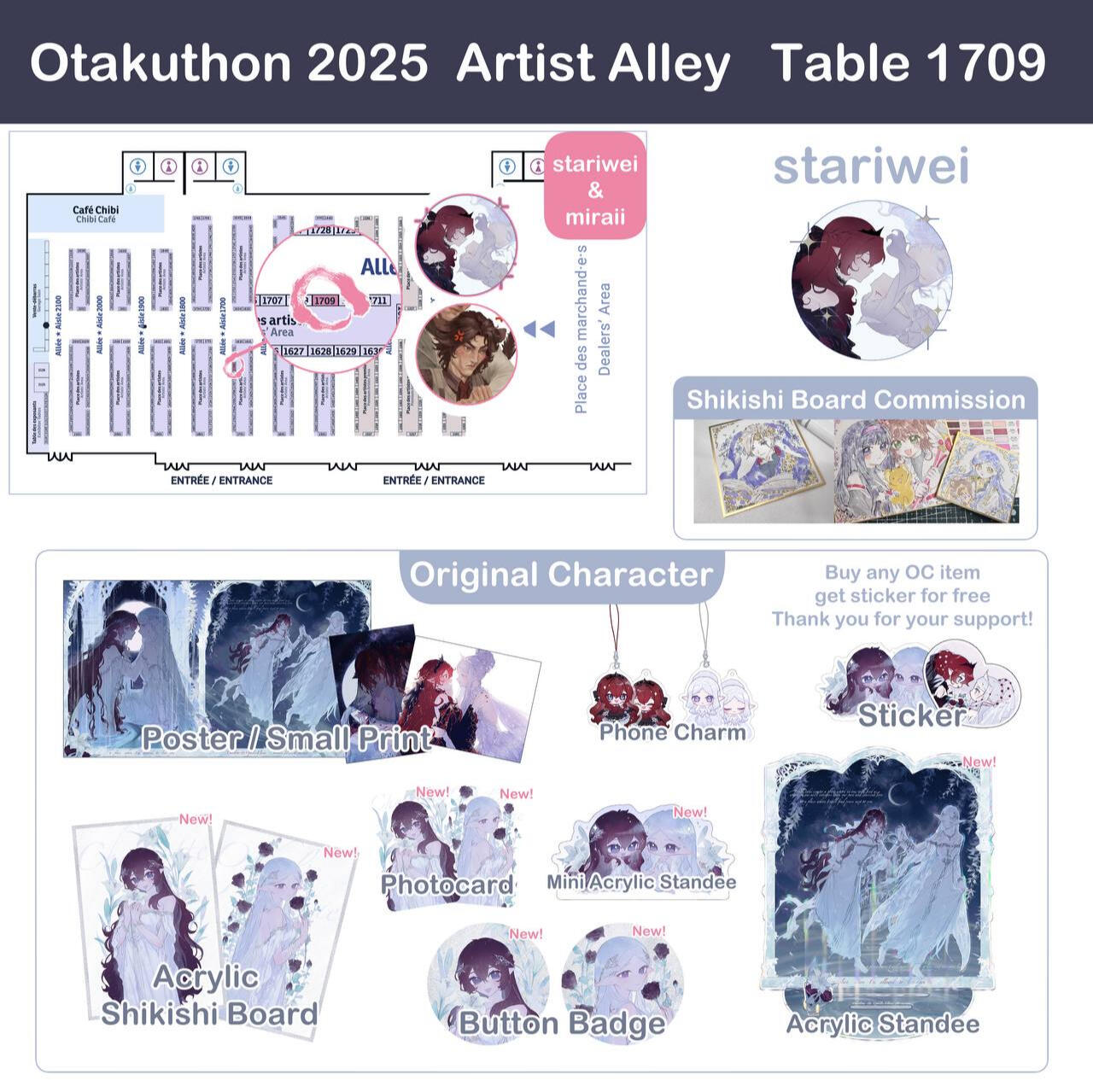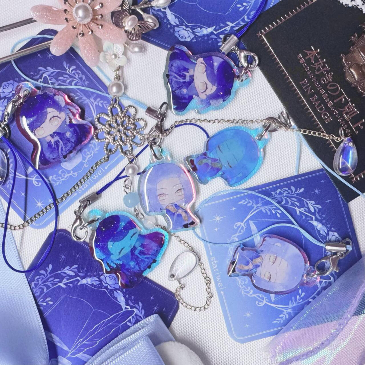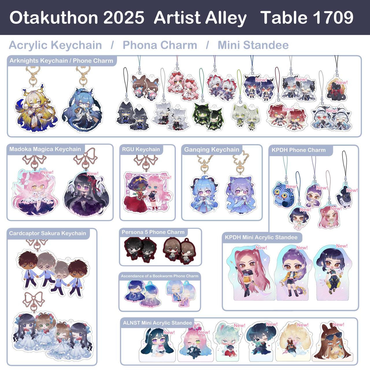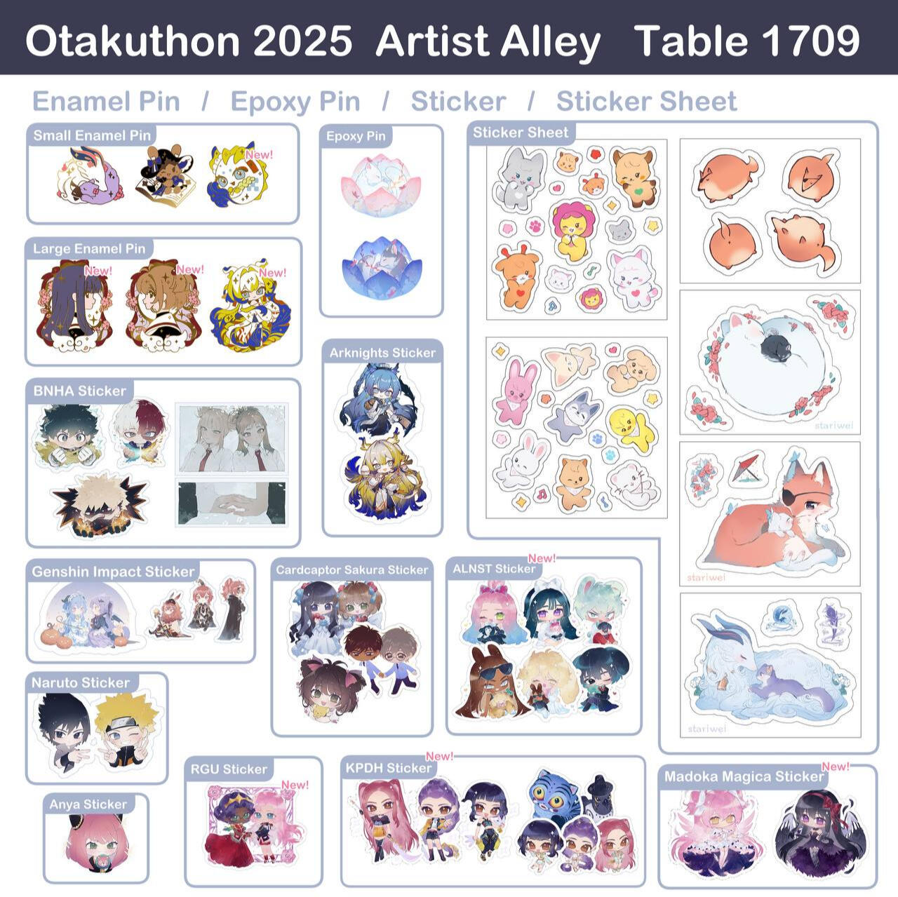 acrylic keychains/phone charms/standee, prints, enamel pins, stickers, button badges of anime/manga/novel/game characters and original characters.Past Event Experience